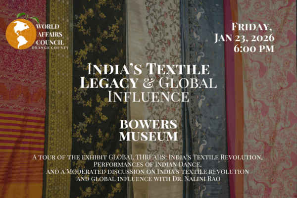 Join us at the Bowers Museum for an illuminating program exploring the global significance of India’s textile traditions. This presentation examines how India’s painted and printed cottons evolved through centuries of artistic mastery, technological innovation, and sustained cultural exchange. Drawing on the themes of the Bowers Museum’s exhibition, Soka University of America’s Dr. Nalini Rao will trace how these textiles traveled across continents, shaped international trade, influenced artistic production from Cairo to London, and forged enduring cultural connections. Through a diplomatic and historical lens, the program highlights India’s role as a creative and commercial nexus, where global encounters inspired new techniques, colors, and designs. Attendees will gain deeper insight into how India’s textile artistry became a transformative force in world history and remains a vibrant, evolving tradition today.