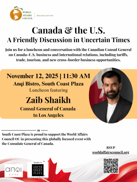 Join the World Affairs Council–Orange County for a special luncheon featuring the Canadian Consul General, who will share insights on the state of Canada–U.S. business and international relations, including tariffs, trade, tourism, and new cross-border business opportunities.