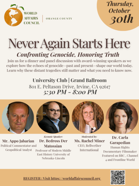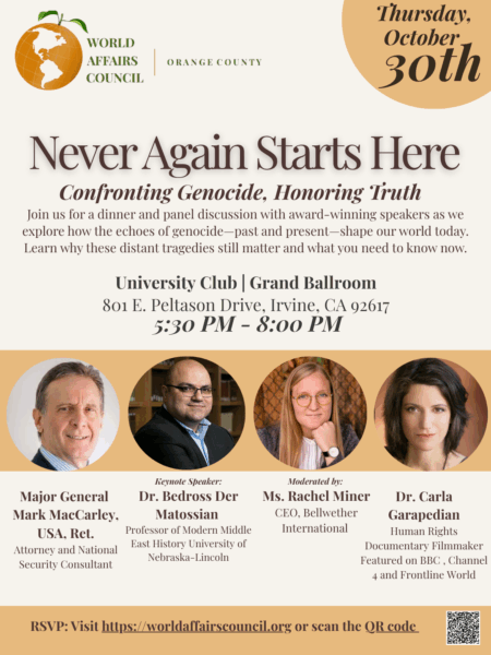 This event will focus on the importance of addressing genocide. In addition to the issue of compelling moral outrage, genocides are literally affecting our own security and economic realities in the here and now, even when they have occurred thousands of miles away or many years ago. This engaging discussion brings in experts in their field in an academic environment which offers space to discuss how we can utilize the international framework to address these issues and work together to bring an end to these atrocities.