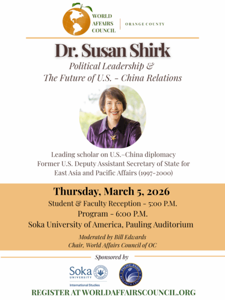Dr. Susan Shirk, research professor and director emeritus of its 21st Century China Center at the UC San Diego School of Global Policy and Strategy, will speak on current U.S. and China relations at Soka University on Thursday 5 March 2026 at 6:00 P.M. Moderated by Bill Edwards, International Business Expansion Problem Solver, Strategist, and Chair of the World Affairs Council of Orange County, this is sure to be an engaging dialogue on the current climate between two super powers- U.S. and China.
